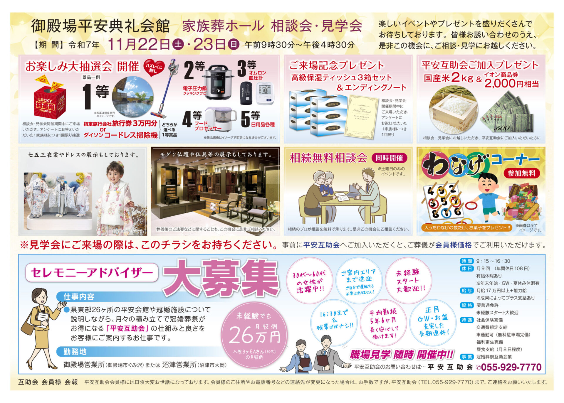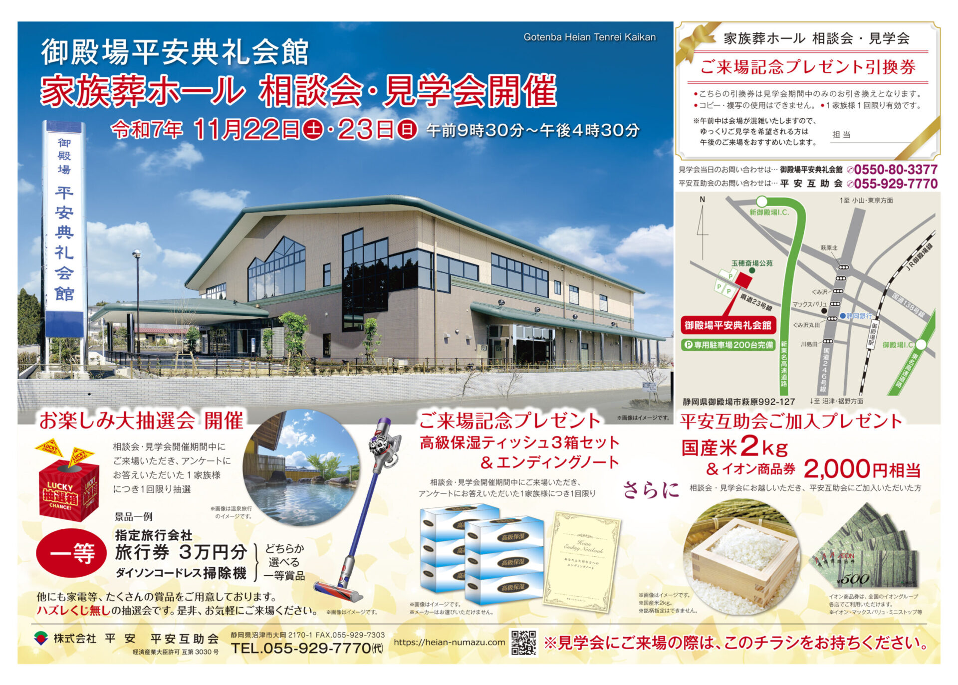 令和7年11月22日(土)23日(日)の2日間、御殿場平安典礼会館にて、家族葬ホール見学会・相談会を開催いたします。互助会やご葬儀の相談はもちろん、式場の見学も可能です。