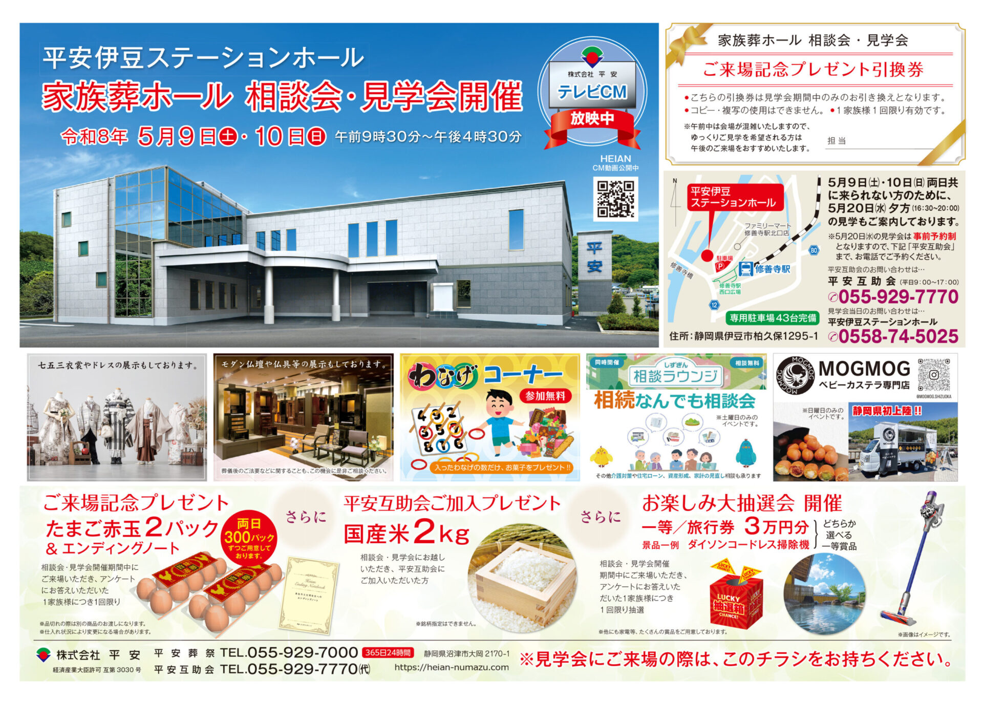 令和8年5月9日(土)10日(日)の2日間、平安伊豆ステーションホールにて、家族葬ホール見学会・相談会を開催いたします。